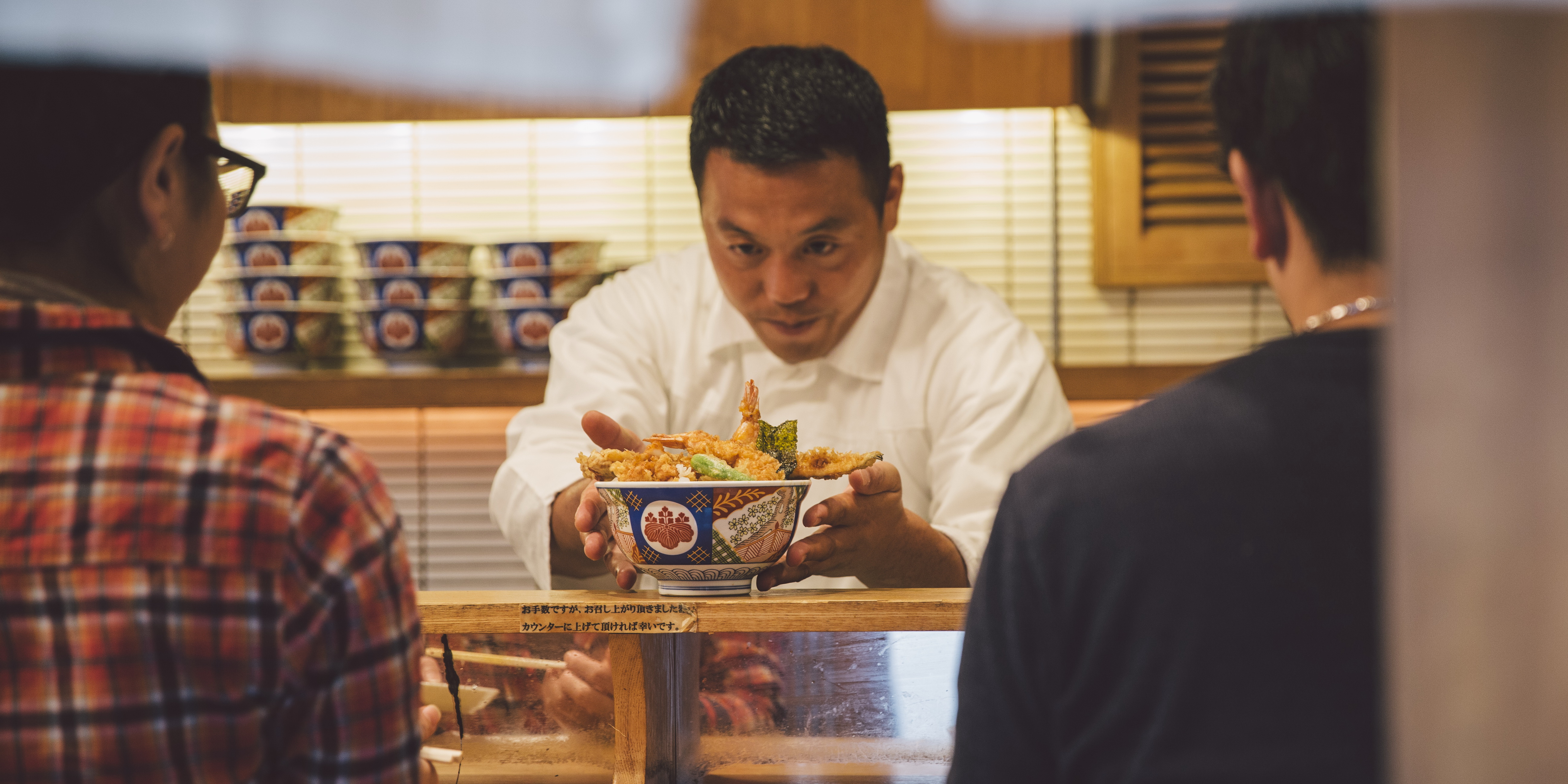 金子半之助の創業者、金子真也さんは飲食業を営む家系に育ち、より多くのお客様に美味しくて豪快な江戸前料理を堪能頂くために、江戸時代の昔懐かしいの味を再現することを決めました。若い頃、祖父から貴重な閻魔帳(秘伝書)を継承し、その中には、門外不出の『秘伝の江戸前の丼たれ』の作り方があり、この秘伝の丼たれに合うタネ(材料)との試行錯誤を重ね、2010年にようやく江戸前天丼一杯が完成しました。秘伝たれと相性のいいタネとしては穴子、えび、ホタテ、いかなど豪華で豊かな食材を揃えた上、祖父の名前をブランドにすることで、金子半之助がこだわり続けた「粋」の精神を継承し、「お客様に豪快な料理をリーズナブルな価格で提供致します」。